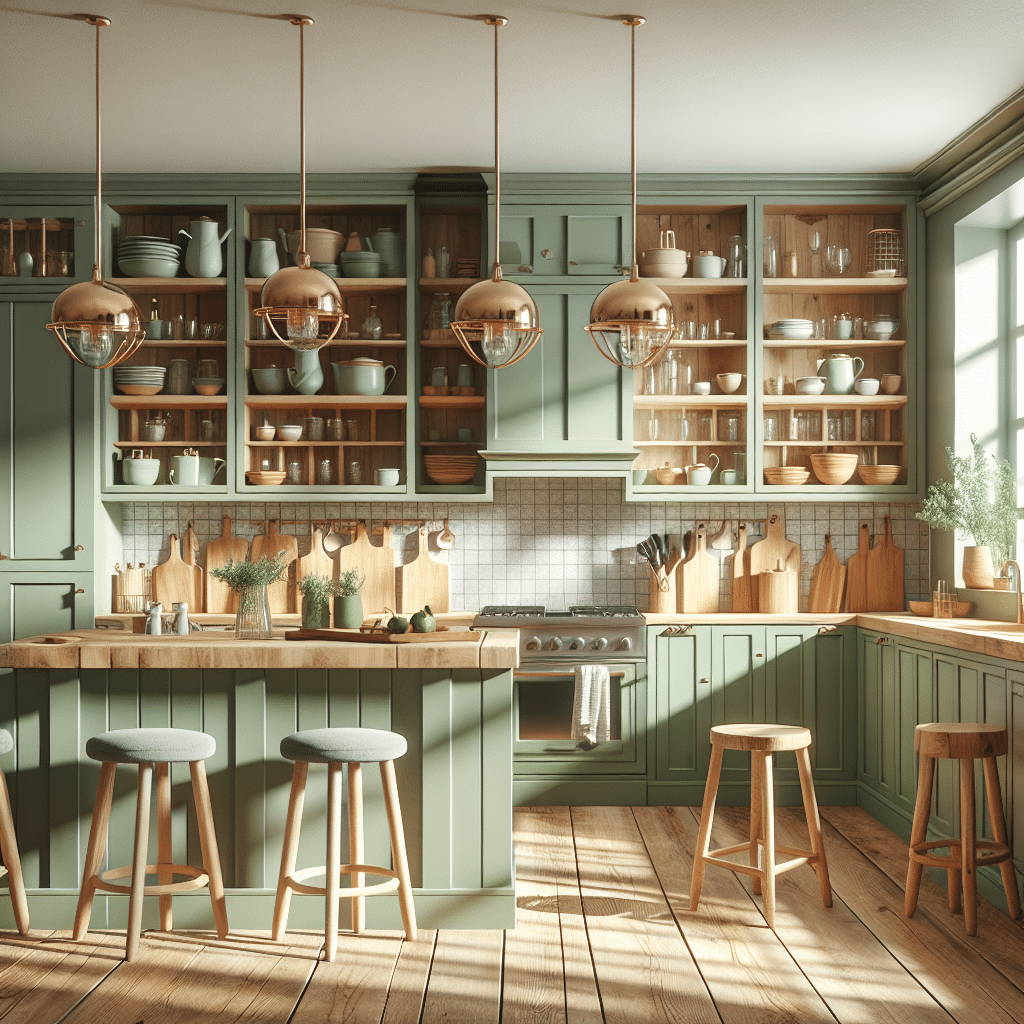 La iluminación también juega un papel fundamental en esta armoniosa combinación. Las lámparas con luz cálida realzan la suavidad del verde y el brillo de la madera, creando un ambiente acogedor que se disfruta durante el día y se transforma al caer la noche. Además, elementos decorativos como plantas o utensilios en tonos terrosos aportan un regalo visual que complementa el espacio.
