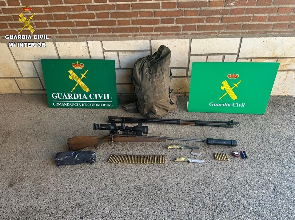 Tras la detención se le intervino el arma utilizada a estas personas, comprobando que tenía la numeración borrada, para impedir su plena identificación, además llevaba instalados un visor nocturno y un silenciador, para lo que habían modificado la boca del cañón. También se les intervino una mochila con cuchillos de caza, munición y otros enseres.